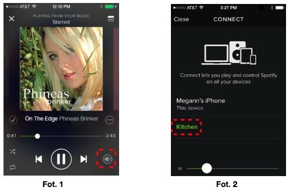Spotify Connect działa podobnie do Apple Airplay. W celu odtworzenia muzyki trzeba najpierw wybrać utwór w aplikacji spotify, zainstalowanej na telefonie lub tablecie. Gdy muzyka gra, wybieramy urządzenie Russounda, naciskając ikonę głośnika "Spotify Connect" (Fot.1) i wybierając z listy dostępnych (Fot. 2)