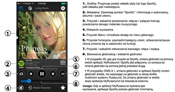 Spotify można obsługiwać z aplikacji MyRussound. Nalżey wybrać w X5 lub DMS-3.1e z listy źródeł w menu "Spotify".
