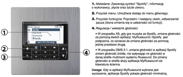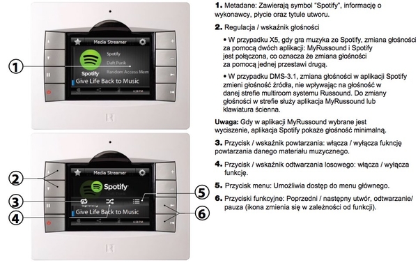 Okładki oraz metadane wyświetlają się zarówno w aplikacji Spotify, jak i MyRussound. Ta druga (lub klawiatury ścienne) może sterować podstawowymi funkcjami serwera Spotify (głośność, poprzedni / następny utwór, kolejność losowa, powtarzanie, odtwrzanie, pauza). Uwaga: wybór z Menu Spotify może być wyłączony w opcjach menu aplikacji MyRussound.