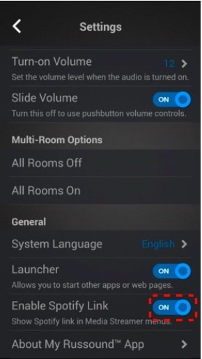 W menu ustawień, Spotify może być włączone lub wyłączone jako opcja w menu Media Streamera, w aplikacji My Russound. Funkcja ta jest włączona fabrycznie.